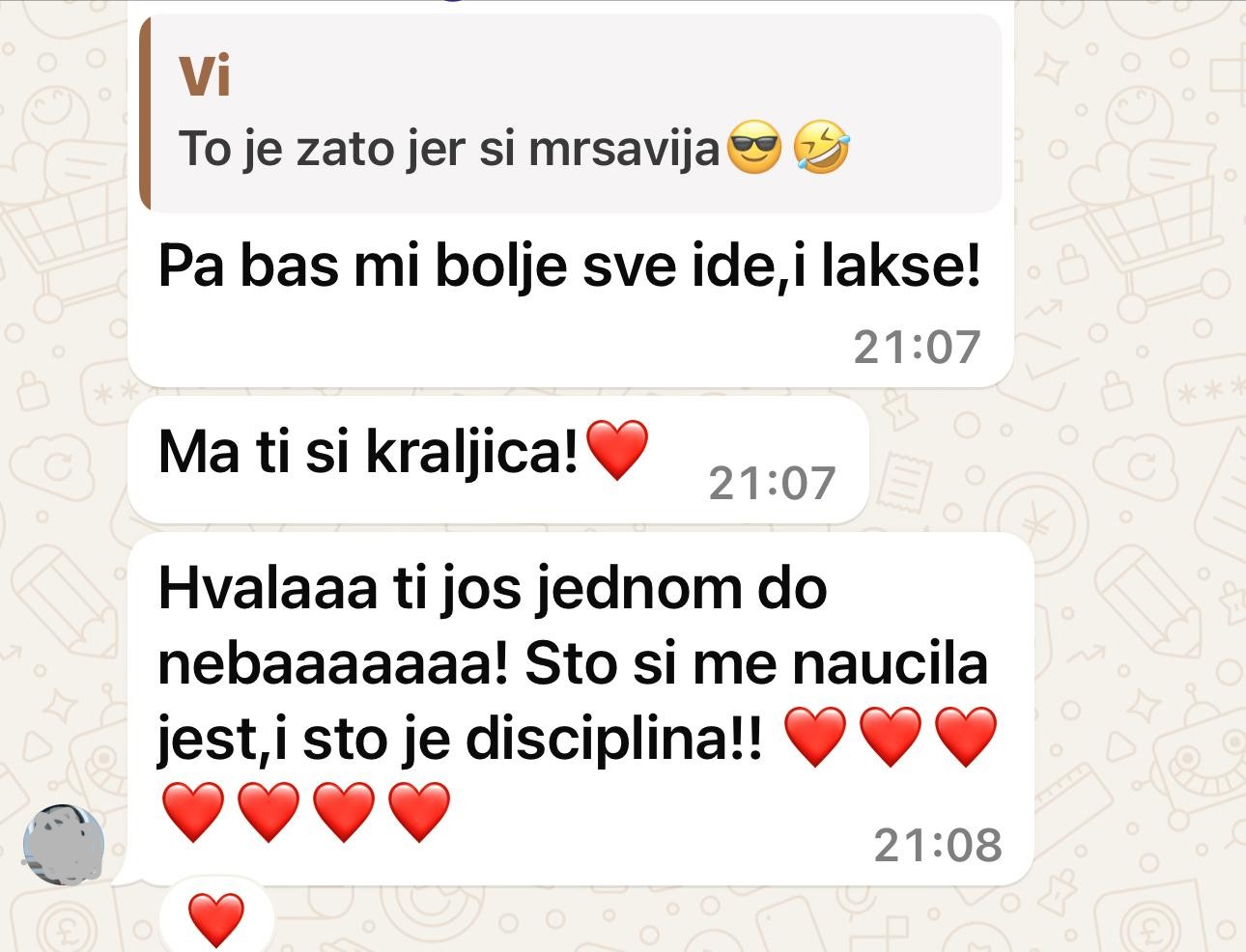 Učim te kako da sama složiš svoj obrok tako da i nakon programa ostaneš dosljedna, jer će to biti jedino što će ti odgovarati kada završimo – vjeruj mi. Konačno ćeš naučiti hraniti se u službu svog tijela i zdravlja.